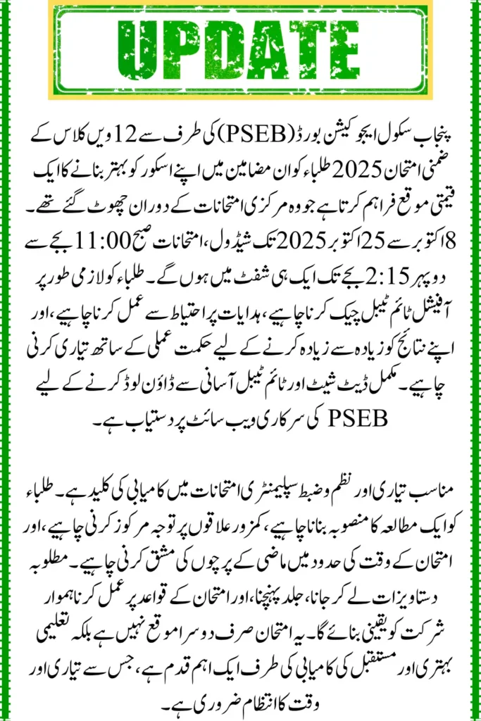 The Punjab School Education Board (PSEB) conducted the 12th class supplementary exams from August 8 to October 11, 2025. These exams gave students a chance to improve their scores in subjects they did not pass in the main exams. The exams were held in a single shift from 11:00 AM to 2:15 PM.