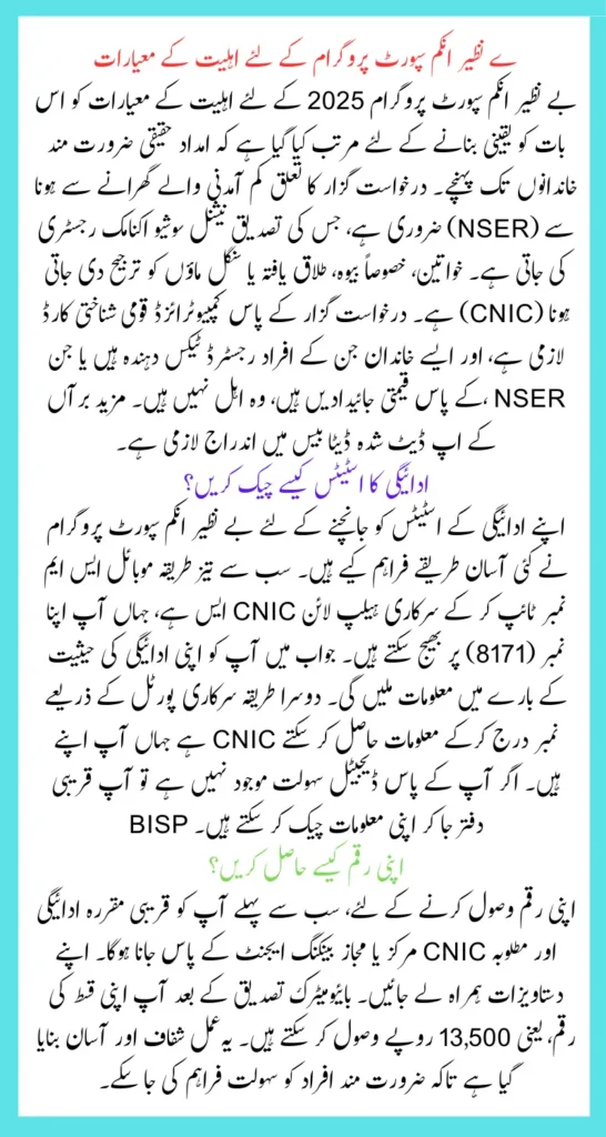 Benazir Income Support Programme News Eligibility for the Benazir Income Support Program determine through a comprehensive process to ensure that the assistance reaches those who genuinely need it. Here are the key criteria for 2025: