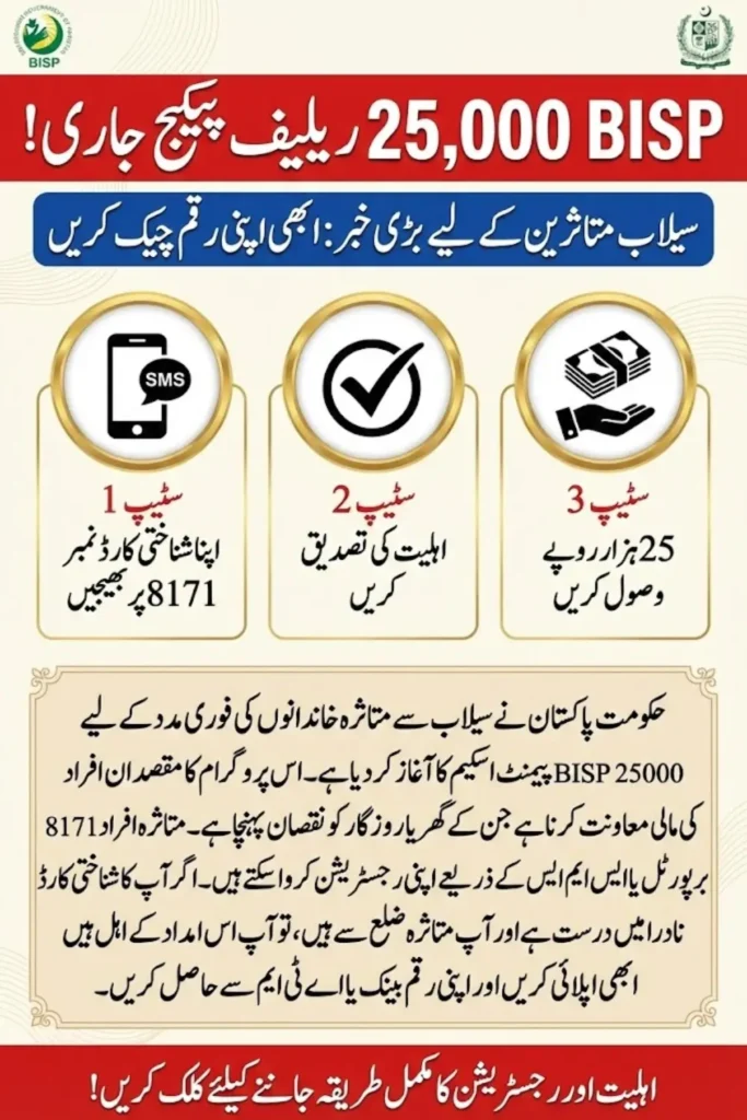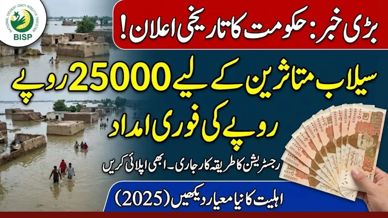 BISP 25000 Payment Scheme is a new relief program by the Government of Pakistan. It grants a cash grant of PKR 25,000 to families affected by the recent floods. This program comes under the BISP. It specifically targets people who lost homes, properties or jobs resulting from a natural disaster. The main objective is to provide rapid, temporary cash support that flood-affected families can utilize for food, medicine, or any other daily needed supplies.