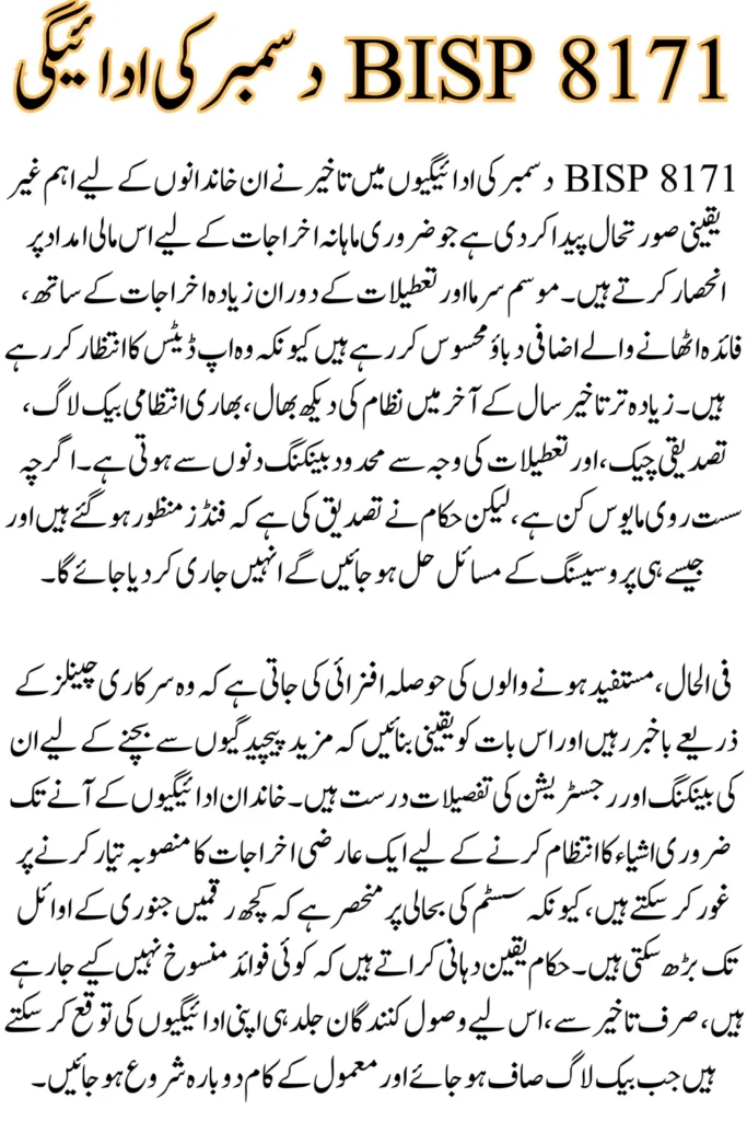 BISP 8171 December Payment Delay a major concern for many beneficiaries who rely on monthly assistance to manage their essential expenses. As the month progresses, families are finding it difficult to plan their budgets due to uncertainties around when the delayed payments will finally arrive. Many people depend on these payments for housing, food, transportation, and medical needs, so any disruption can create immediate and stressful challenges.