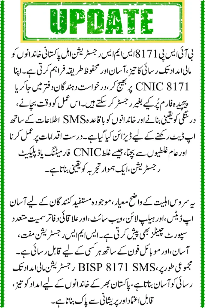 Using SMS registration also provides immediate confirmation and easy updates for existing beneficiaries. With clear eligibility criteria and dedicated support channels, BISP 8171 makes financial assistance accessible to those who need it most. Registering today ensures your family receives reliable support and contributes to a smoother, more efficient aid process.