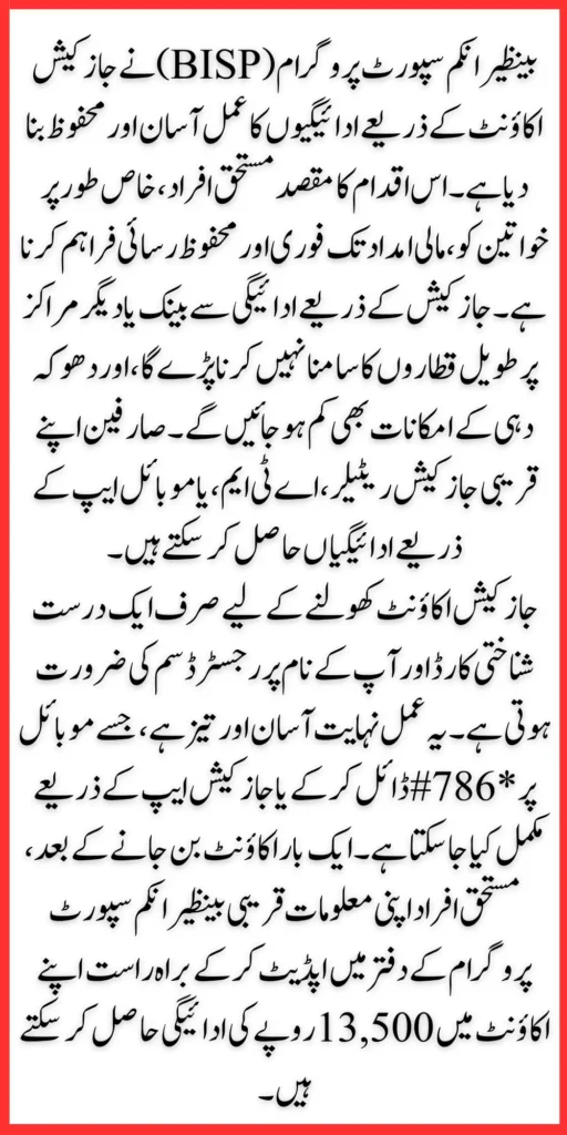 Delayed Payment: Contact the BISP helpline or visit a Jazz Cash Support Center to confirm your eligibility and payment status.