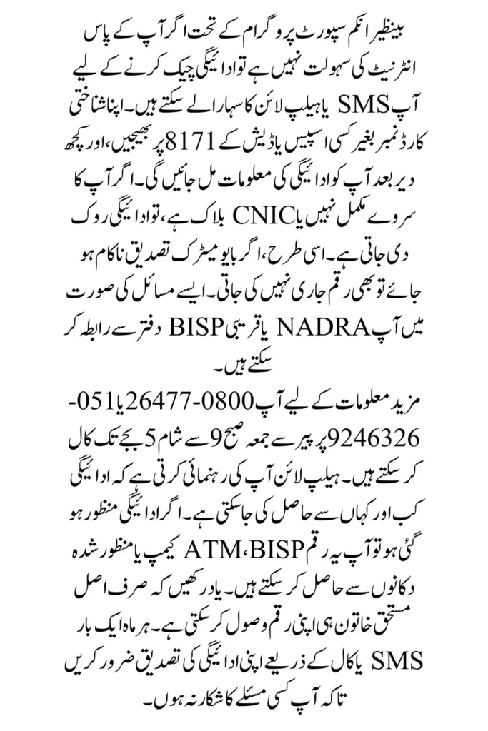 In this article, you have been told that if you do not have a network facility you do not have internet access, then how can you get information about your BISP payment without an online portal. You can get complete information about your BISP by calling the helpline or by sending an SMS to 8171. From there you can also find out whether your payment procedure has been completed or not.