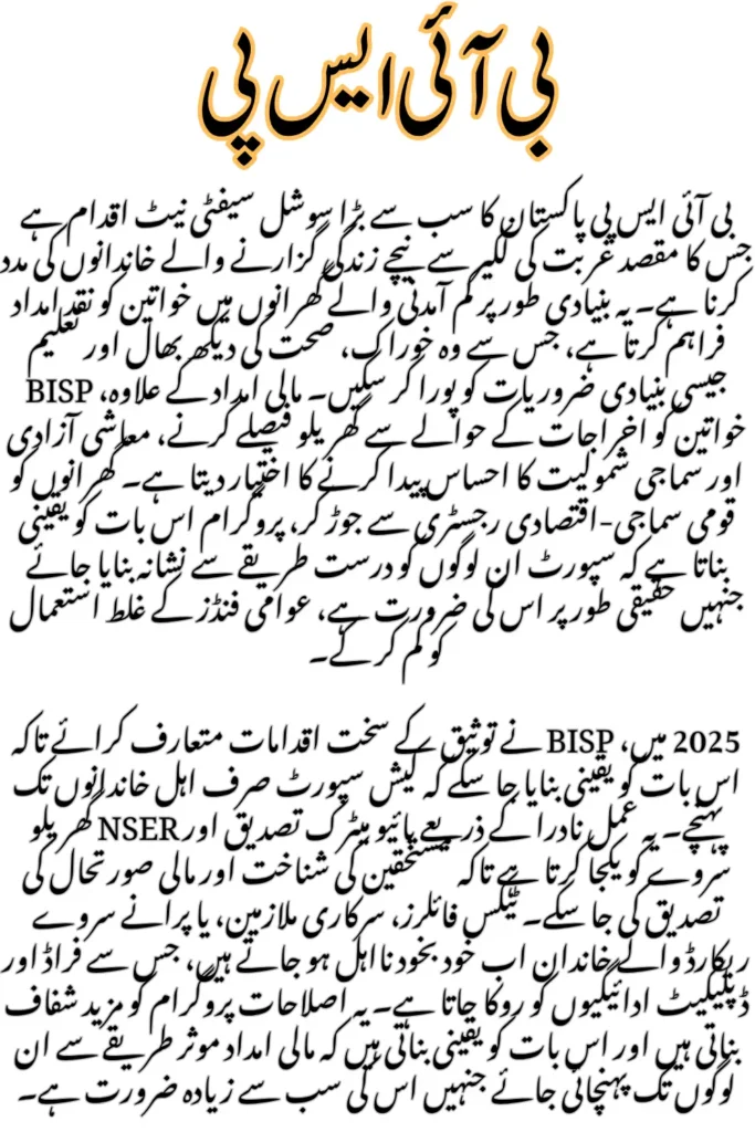 The BISP is a social welfare initiative by the Government of Pakistan that provides financial assistance to the country’s poorest families. Its primary goal is to reduce poverty by offering unconditional cash support, especially to women in low-income households, helping them meet essential needs like food, healthcare, and education.