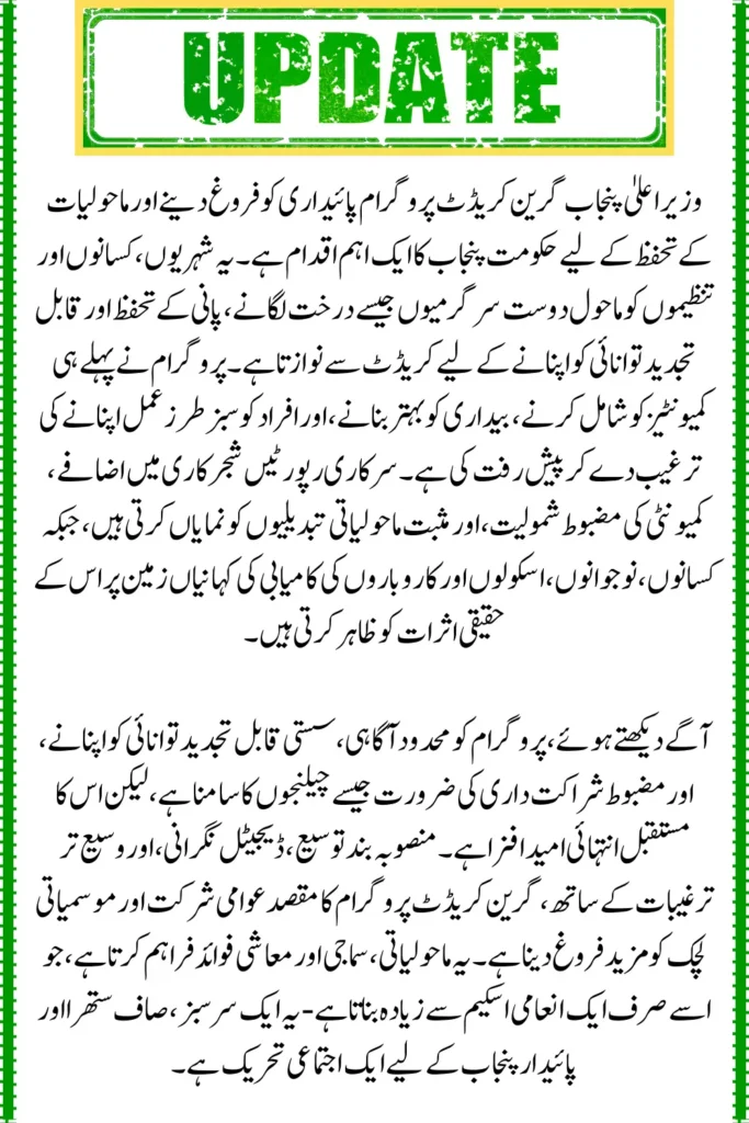The CM Punjab Green Credit Program is a new initiative by the Government of Punjab to promote eco-friendly practices and sustainable development. This program rewards individuals, farmers, and organizations who take part in tree plantation, water conservation, and clean energy projects. The goal is to make Punjab greener, cleaner, and more climate-resilient. By encouraging active participation, the program supports environmental protection and creates long-term benefits for both people and nature.