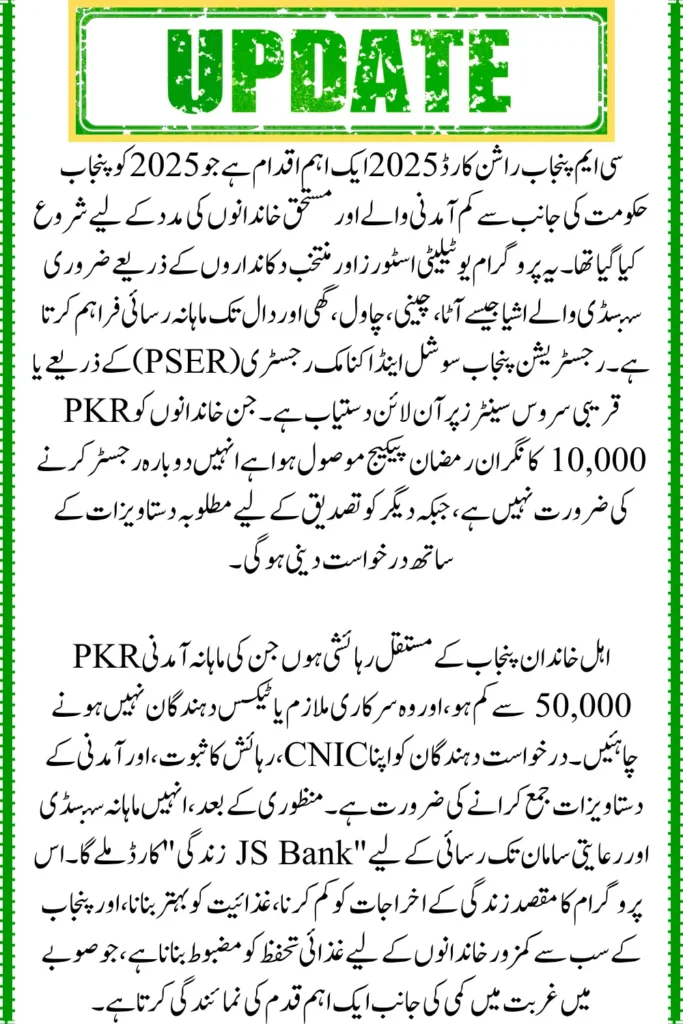 The CM Punjab Ration Card 2025 program was launched on 2025, by the Punjab government. It aims to provide a monthly ration to poor and deserving families. In the first phase, 1.5 million families will receive ration cards. These cards allow access to subsidized essentials like flour, sugar, rice, ghee, and lentils from utility stores and selected vendors. Families who received the Nigran Ramadan Package of PKR 10,000 do not need to re-register. Other families can register online or at nearby service centers through the Punjab Social and Economic Registry (PSER).