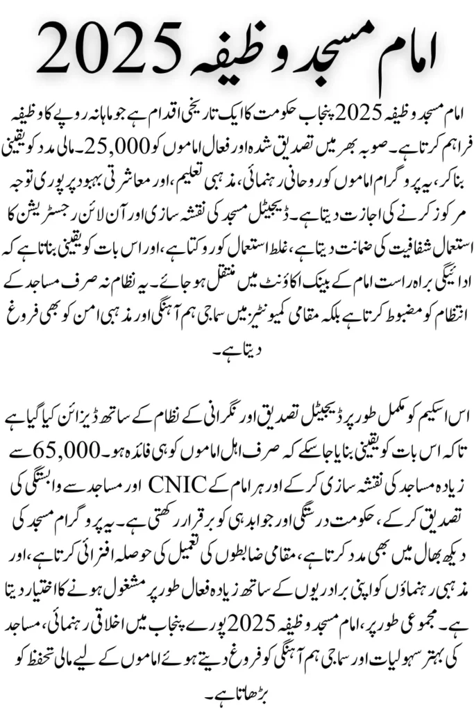 The Imam Masjid Wazifa 2025 is a landmark initiative by the Punjab Government to financially support imams serving in mosques across the province. By providing a monthly stipend of Rs. 25,000, the program allows imams to focus fully on prayers, religious education, and community guidance without financial worries. The use of digital mosque mapping and online registration ensures transparency, accuracy, and timely payments directly to their bank accounts.