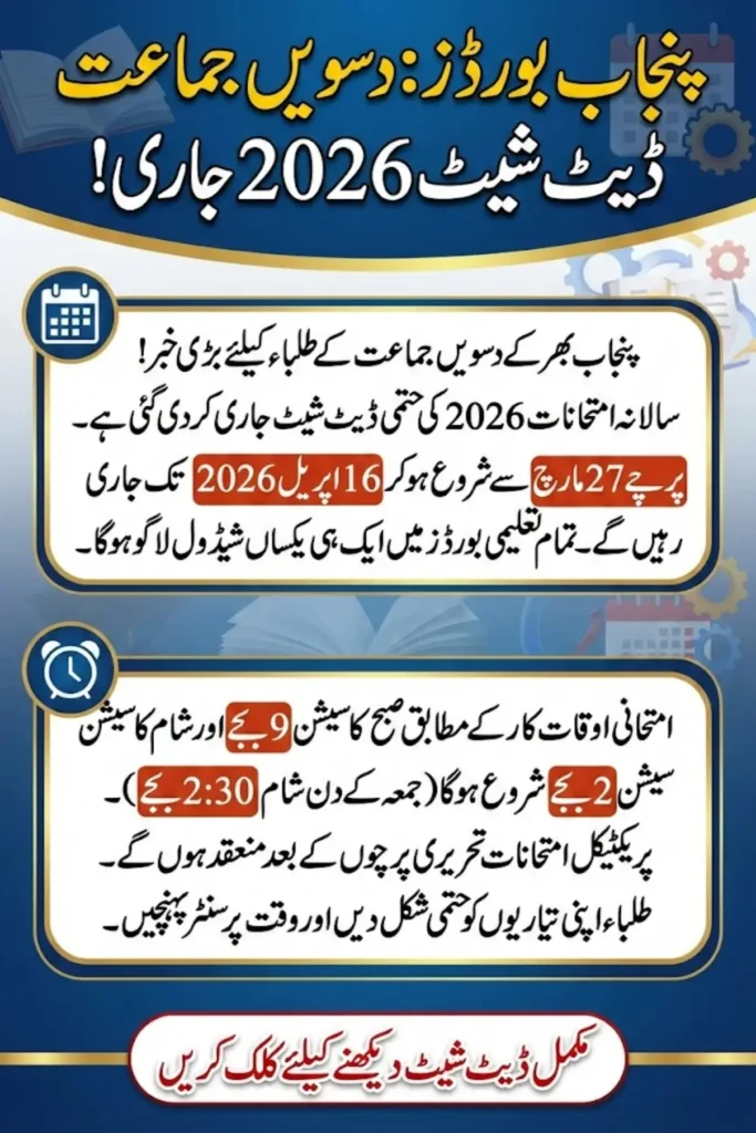 The Punjab boards have officially released the Punjab Class 10 Date Sheet 2026 for annual matric examinations. According to the announcement, exams will begin on March 27, 2026, and continue until April 16, 2026. A uniform schedule will be followed across the province to ensure fairness and smooth management of examinations. This update allows students to organize their study plans in a structured manner.