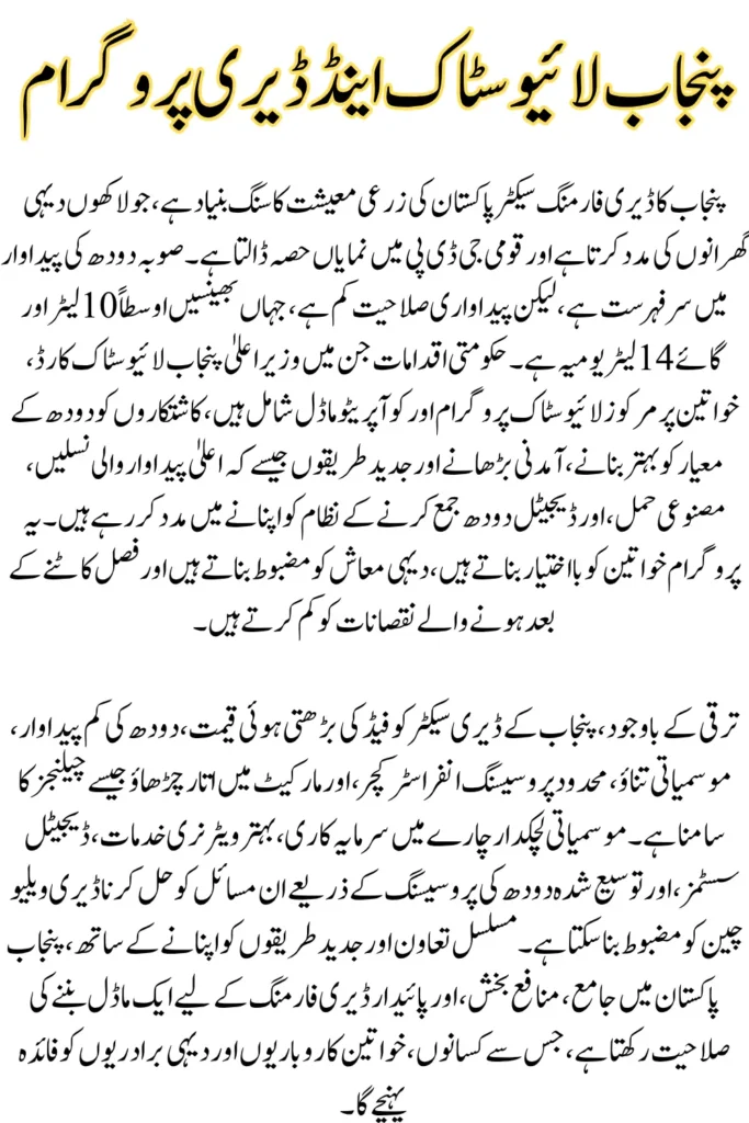 The Punjab government has introduced key programs to support dairy farmers in 2025. The CM Punjab Livestock Card provides interest-free loans up to PKR 540,000 for feed, medicine, and animal care. Small-scale farmers and women benefit from livestock distribution schemes and training in modern dairy practices. Digital systems ensure easy loan access, veterinary guidance, and market support. These initiatives aim to boost productivity, reduce losses, and promote sustainable, inclusive growth in Punjab’s dairy sector.