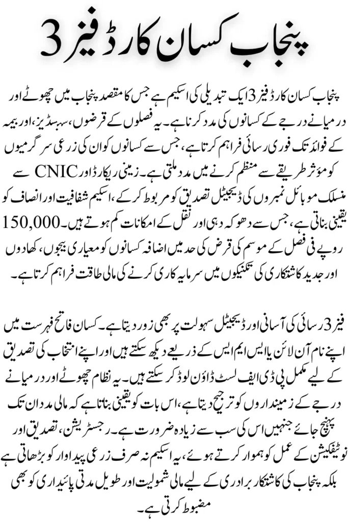 The Punjab Kisan Card Phase 3 is a significant initiative aim at empowering small and medium farmers in Punjab. By providing easy access to financial support, higher loan limits, and digital transparency, the scheme ensures that farmers can manage their crops efficiently and improve productivity. The focus on verified land records and CNIC-linked mobile numbers makes the process fair and minimizes misuse.